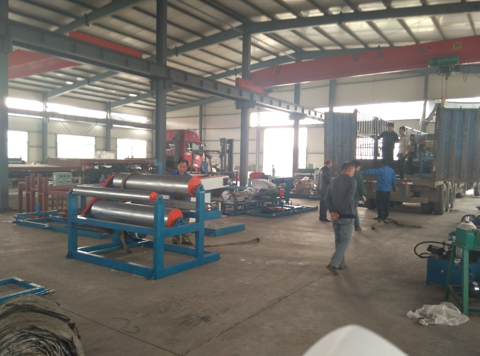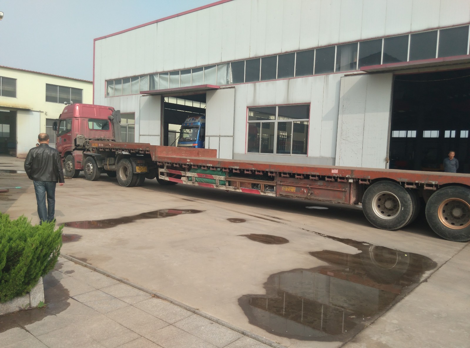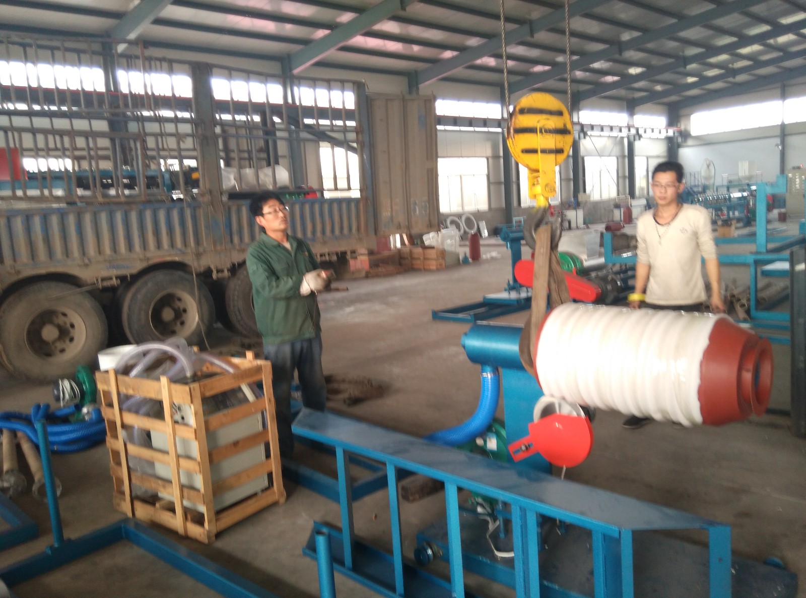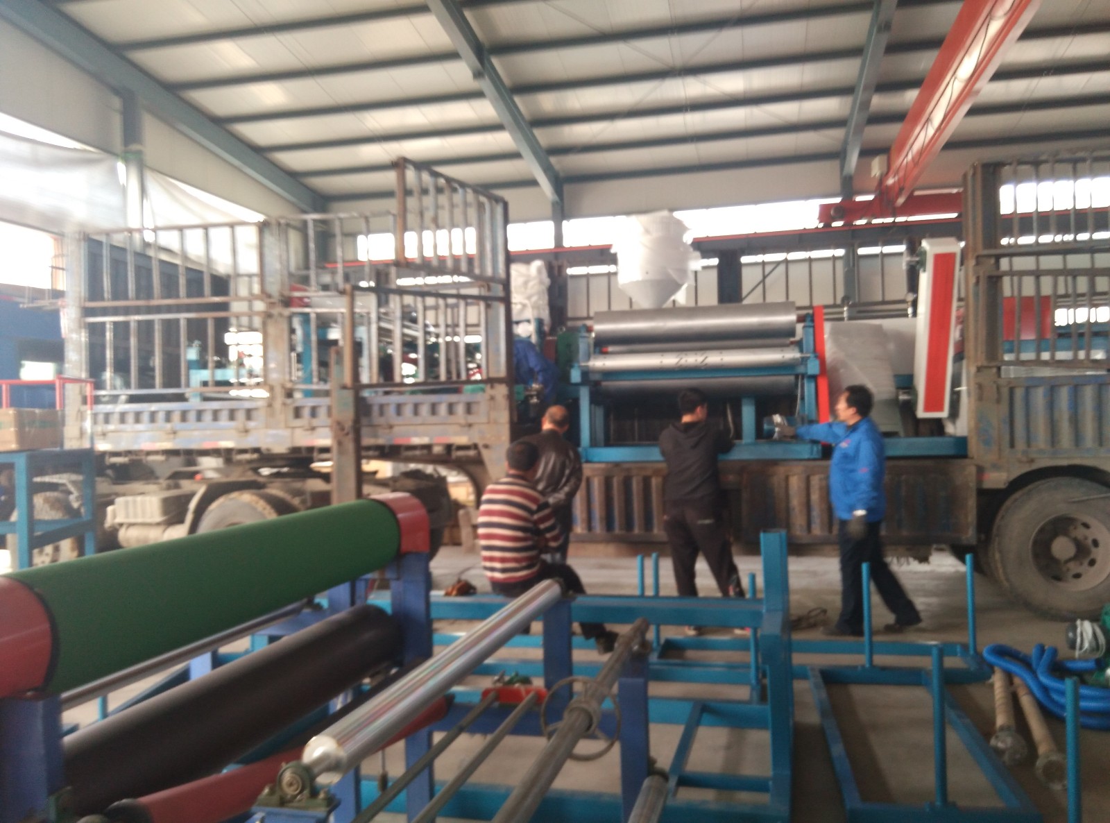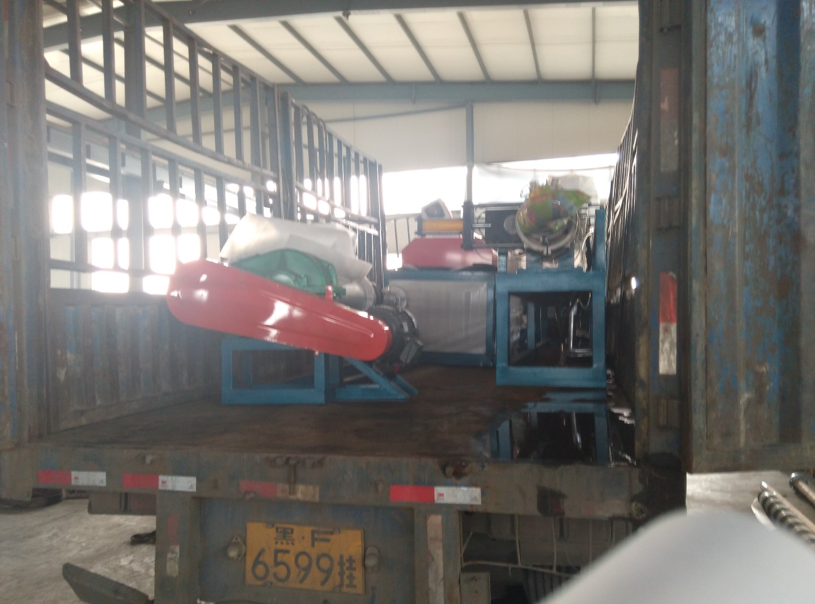 黑龙江邓总105珍珠棉发泡机发货 105epe珍珠棉生产设备发往黑龙江装车图片。当天恰巧临沂高总的200珍珠棉发泡机也进行打包发车,所以出现了图中的一蓝一红两辆大车情形。蓝色车发黑龙江的红色车发临沂的。